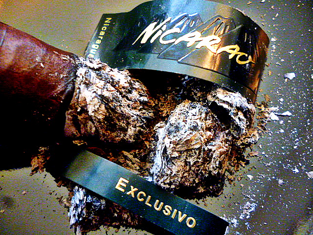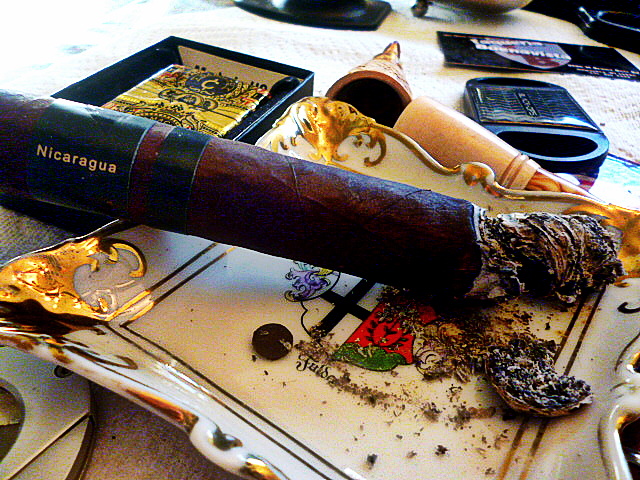 Because the stick is packed to the gills, it smokes very slowly. And since I write and smoke at the same time, I have to put the cigar down to let it catch up.