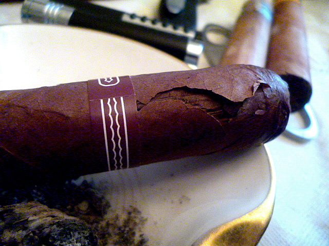 The sinking feeling that this cigar may be a total loss looms in front of me. There is still a plug between both holes I made with the ice pick. And the wrapper isn’t getting any better.