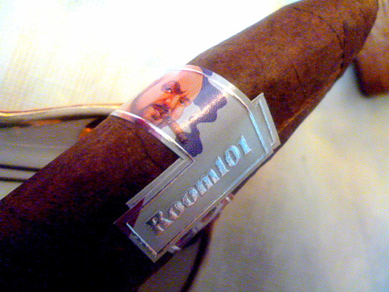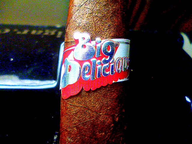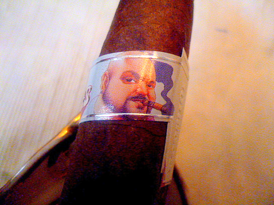 This is a big honker. The Habano 2000 wrapper is gorgeous. A medium brown with hints of reddish hue. The stick is rock solid with just the right amount of give. Seams are tight. And there is no shortage of veins. There is a slight oily sheen. And some small toothiness. The cap construction is beautifully done. The foot is encased in a very shaggy bit of wrapper. The wrapper has a great sense of humor. Big Delicious is stamped in silver and red. It looks like a 1950’s diner sign. And then there is Abe’s punum (Yiddish for face) right there; with a devilish look on his face and with a lit cigar in his mouth. On the back side of the band is a white and silver banner declaring “Room 101.” On the oppoiste side of the band is a caricature of Matt Booth. And next to Matt, is his dog, Sadie. In the picture, Matt is playing an accordion. Oh God! My folks made me play one as a little guy. I lost all of my friends. You know the saying? “Use an accordion. Go to Jail!”