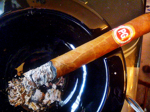 A sweet bee’s honey flavor shows up in a much muted mode. I can taste nuts. The ash was hanging straight and true at the 1” mark until I let it slide into the ashtray for a photo. Yes. I am a schmuck.