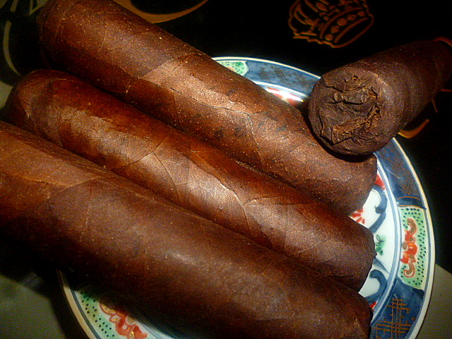The wrapper is gorgeous with an extremely oily wrapper. It is dark brown with a reddish hue. There are a lot of small spider veins. And the seams are shut tight. There is a slight tooth. There is also a covered foot. And no band. I feel the need to load the sticks in my Mossberg.