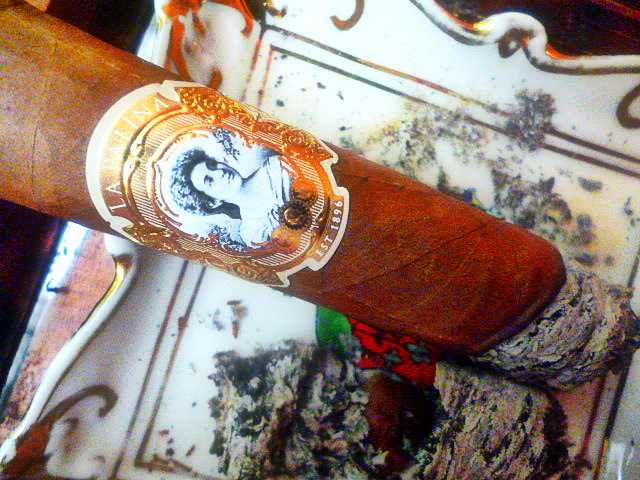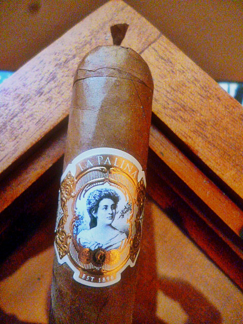 The wrapper is the lightest of browns with a smooth feel. The cigar is relatively solid with some give to it…but yet there is a delicate feel to it as well. The fan tail cap is an interesting after note to the cigar’s construction. There is a nice oily sheen. There is an issue I need to take up with the La Palina folks…the cigar band. It is shiny and bright and in contrasting colors of gold and white. The two worst colors and finish for me to photography with my Panasonic Cheapo Lumix digital camera.