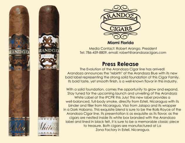 Press Release- Arandoza Cigars Presents their newest blend called Arandoza White Label By Cigar Reviews by the Katman on June 27, 2013 Miami Florida Discover more from Cigar Reviews by the Katman Subscribe to get the latest posts sent to your email. Type your email… Subscribe ‹ Cigar Review- La Flor Dominicana Oro Tubo No. 6 MaduroCigar Review- La Flor Dominicana Oro Chisel Maduro ›Categories: CIGAR REVIEWS