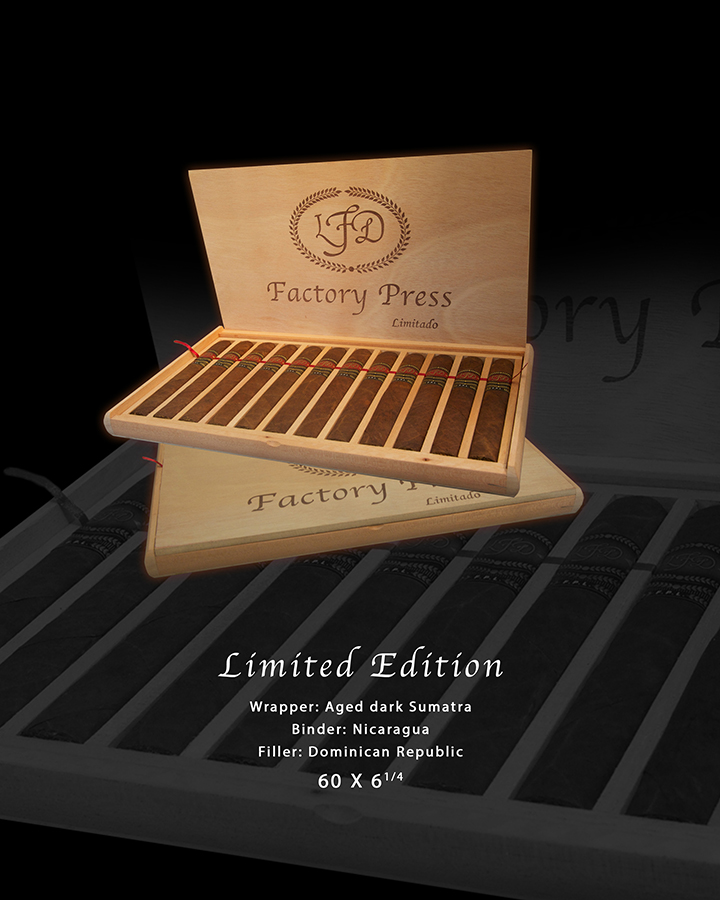Factory Press Limitado – We’ve aged and set aside the darkest Sumatra wrappers we could find for the 2nd installment of this special release. Combined with a Nicaraguan binder and our estate grown Dominican fillers, this cigar provides a rich and powerful flavor worthy of its prestigious name.