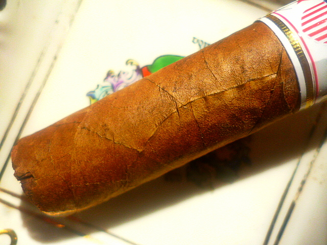 So we will start with the construction. It is a solid cigar but certainly on the funky looking side. The wrapper, which is beige, has quite a bit of discoloration and inconsistencies. I was only sent one cigar for review so I have nothing to compare it to. There are some small veins and there are some tree trunk veins. While mottling of color looks good on a very dark wrapper, it doesn’t look so hot on such a light colored wrapper. The cigar must have been squished a little at some point because it is more of an oval than a round circle. There is a nice little half pig tail on the triple cap. I don’t know if it was meant to be this small or it lost the rest of its tail on its way to market. There is a slight oily sheen and the cigar feels very smooth.