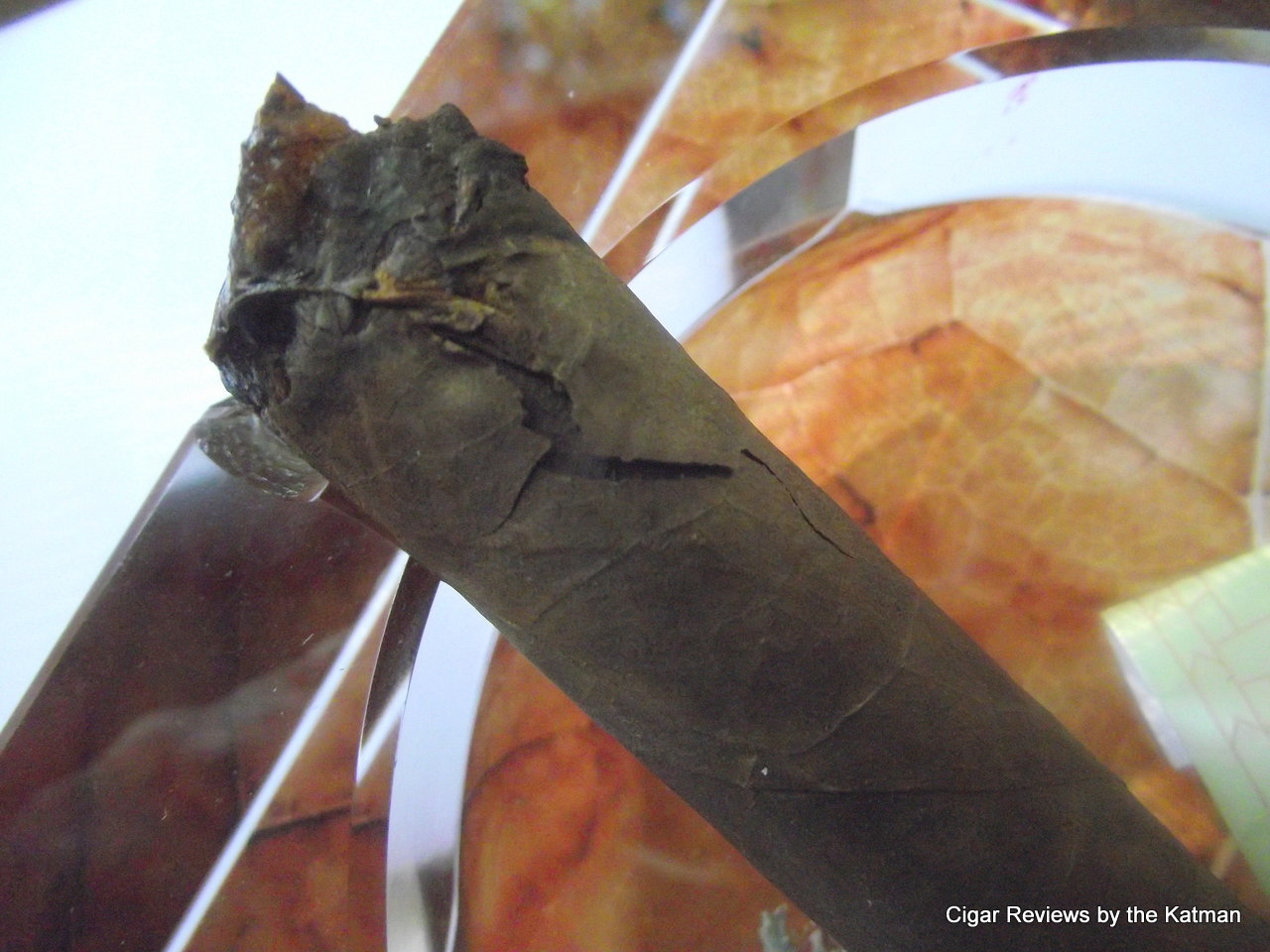 Uh-oh. The wrapper at the cap has cracked. I quickly grab my Kingpin cigar glue. I observe closely and the crack is traveling. The cap itself is a real mess now.