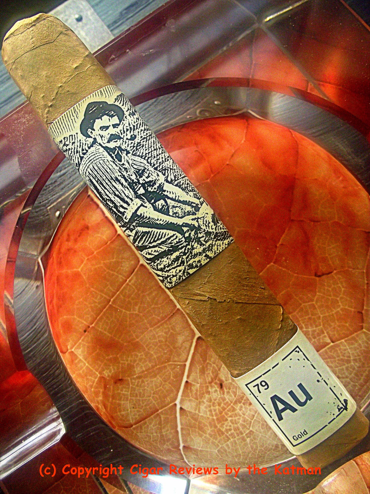 The double cigar bands are pretty cool. The main one, which is huge, is a ‘49er panning for gold. I love the artwork. The other band, at the foot, is like the other blends; showing the name of the cigar from the Periodic Table.