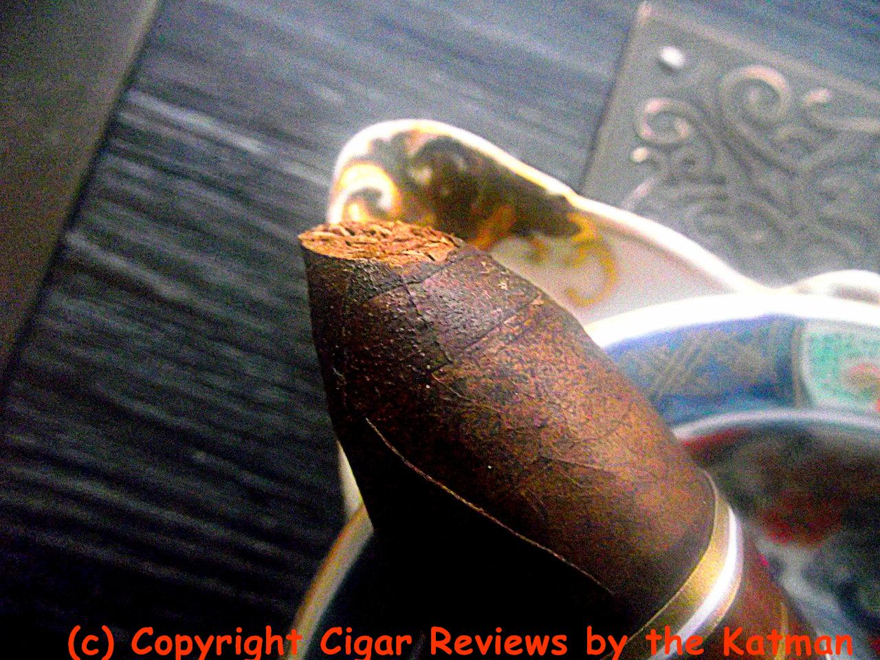 By the half inch mark, the cigar is certainly a flavor bomb. Creaminess appears and rounds things out. The char line is a bit wavy and I correct it. The grip required by one’s teeth to hold on to this stick is akin to a gila monster.