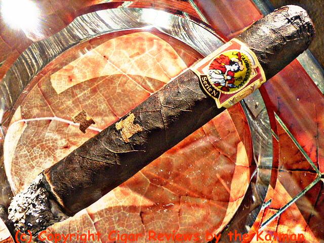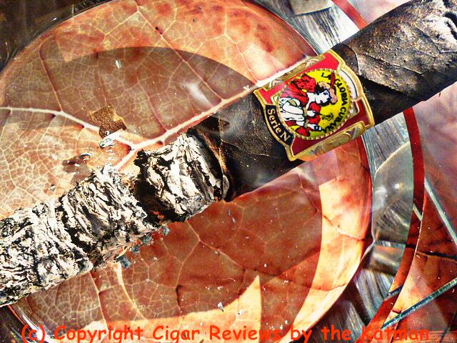 The wrapper is almost coal black. And a little lumpy in places. The dark color hides the veins and exposed seams. It appears to be a triple cap but no way of confirming it. A stamped “N” made of lighter colored leaf is sloppily glued to the front of the cigar. And the rollers are not that precise in its location from stick to stick. In fact, one of the “N”’s falls off while I take photos.