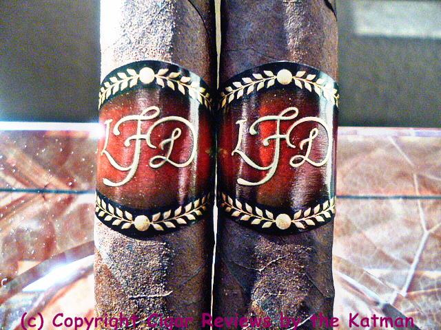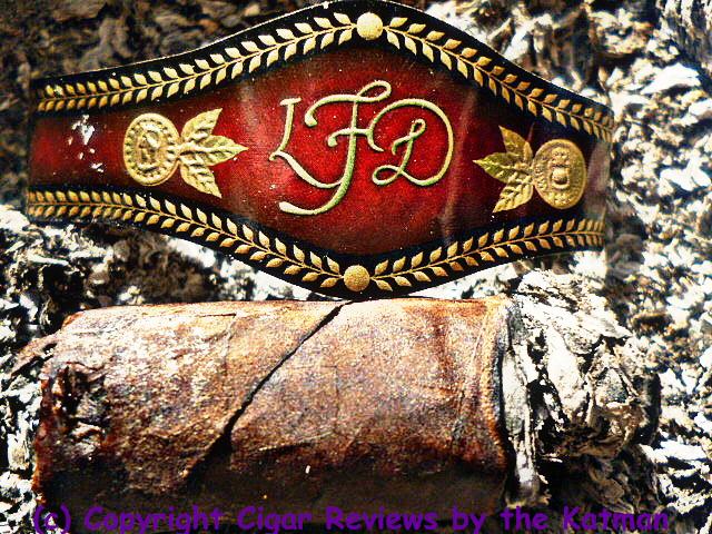 Construction is everything you expect from an LFD. Tight seams. Lots of small veins. A very dark coffee bean colored wrapper with occasional mottling. A beautiful triple cap. Slick as snot on the touch. (Made me gag typing that). And the standard LFD cigar band. And a small pigtail atop like a cherry.