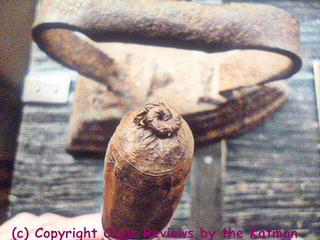 Smoke pours from the foot like a Pittsburgh chimney. The stick is so jam packed that all of a sudden I am having a draw problem. I found the best way to open the passages is to roll the cigar in your palms, gently but quickly, and this works much better than shoving a damn dagger down the middle and cracking the wrapper.