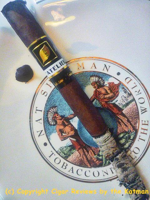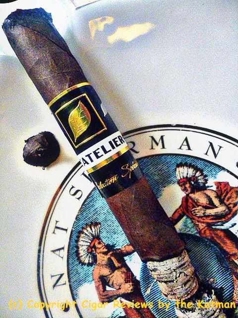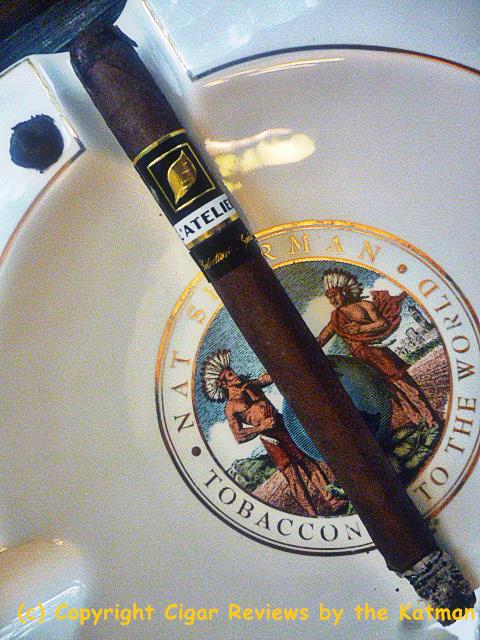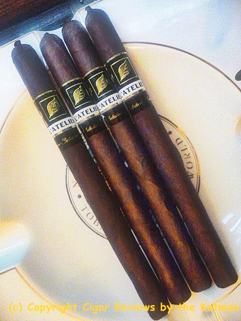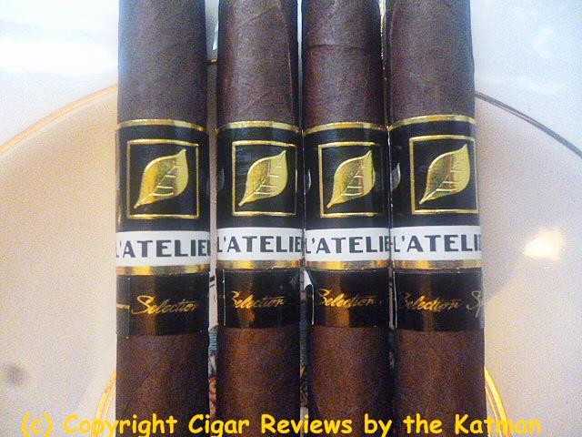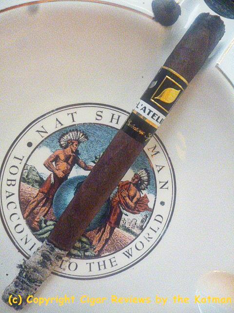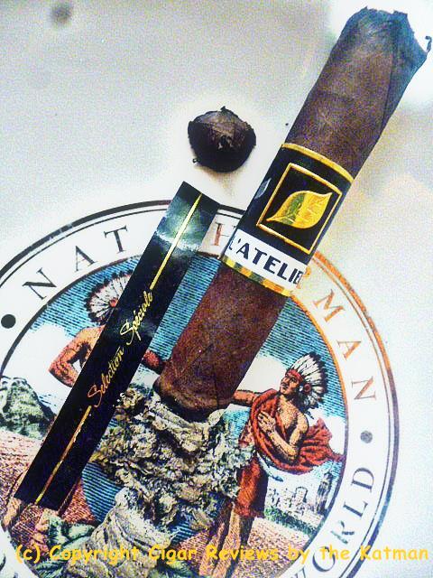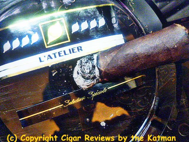 Construction is inconsistent. One stick is covered in veins, the others not so much. The seams on the one I picked to review is perfecto. The triple cap with the little fan tail is perfectly executed. The wrapper has a slight oiliness and is very, very dark. It has the standard L’Atelier cigar band with a secondary band calling out the blend.
