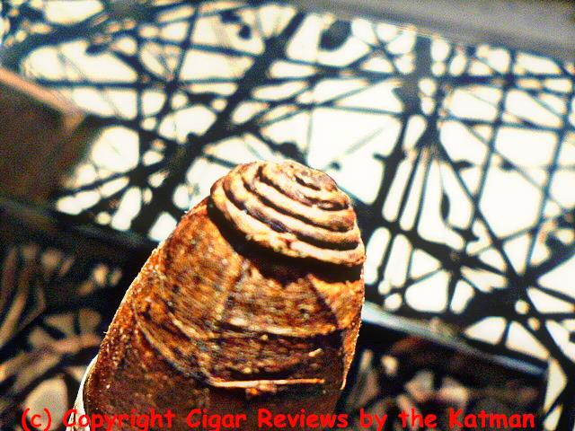 It is an impressive perfecto. Virtually seamless. A lot of veins and even some spooge that looks like a roller went crazy with the cigar glue. The stick is jam packed with tobacco. The wrapper is a slightly oily medium brown. There is toothiness in some parts and smooth in others. There is a slight orange tint to the wrapper’s color.