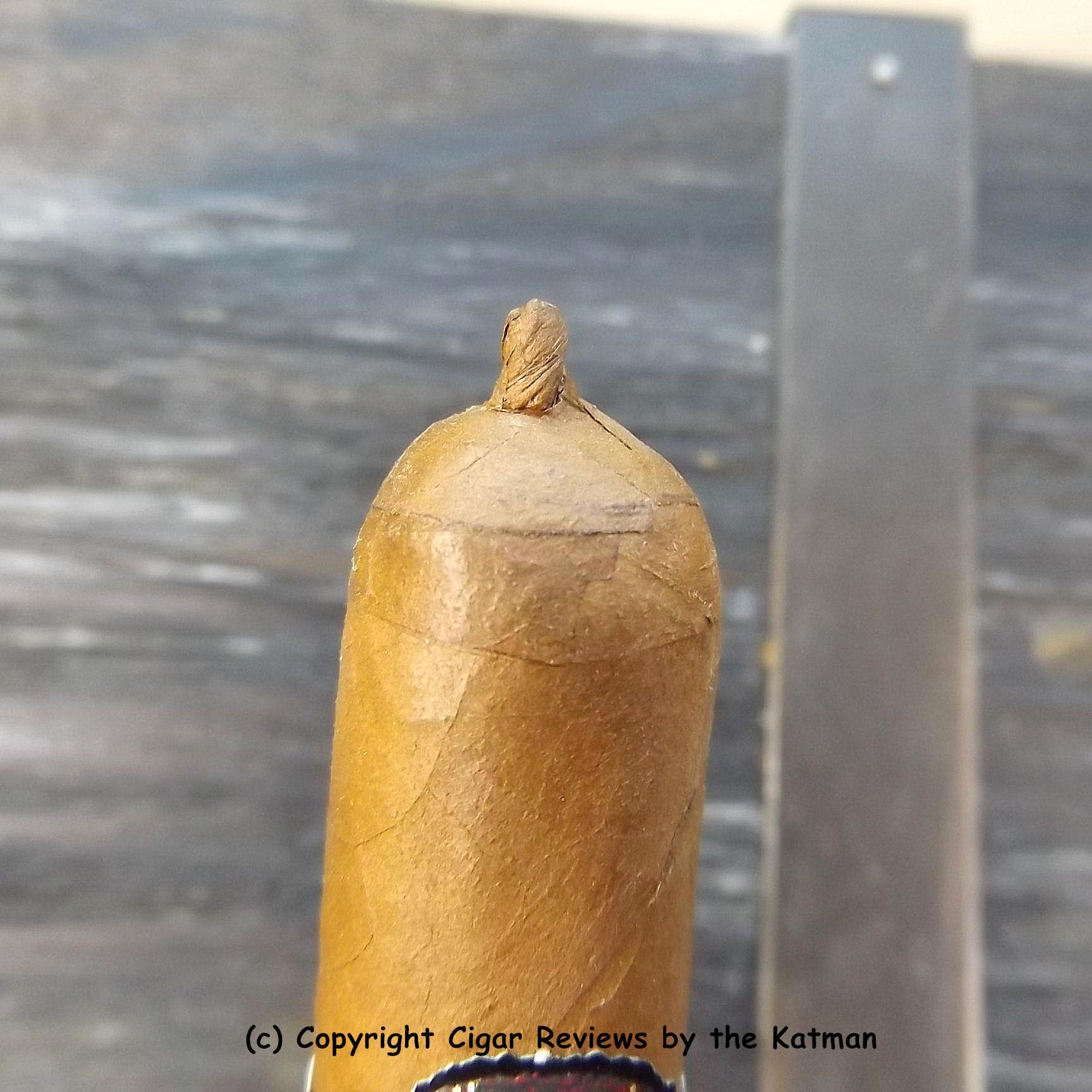 I normally use my big stainless steel four size ring gauge cutter. Specifically, the V cut for all of my cigars. Today, I did the yarmulke cut so I could have the little beanie with the pig tail in the photos. Only problem with a totally open cap, is that Katman drool does a real number on it and quickly. So occasional clips will be necessary. If you would like a signed cap clipping with Katman drool on it, contact me via my email address.