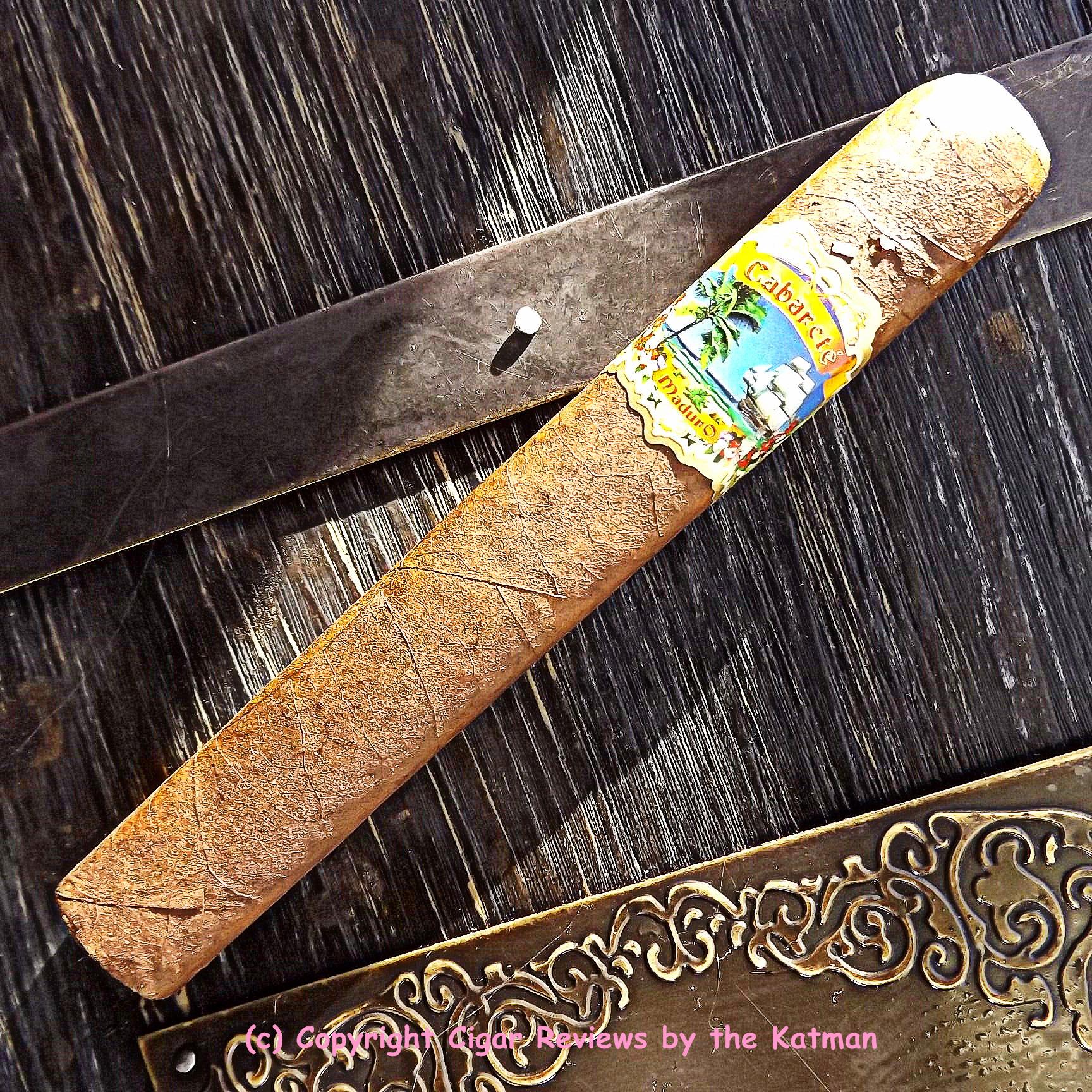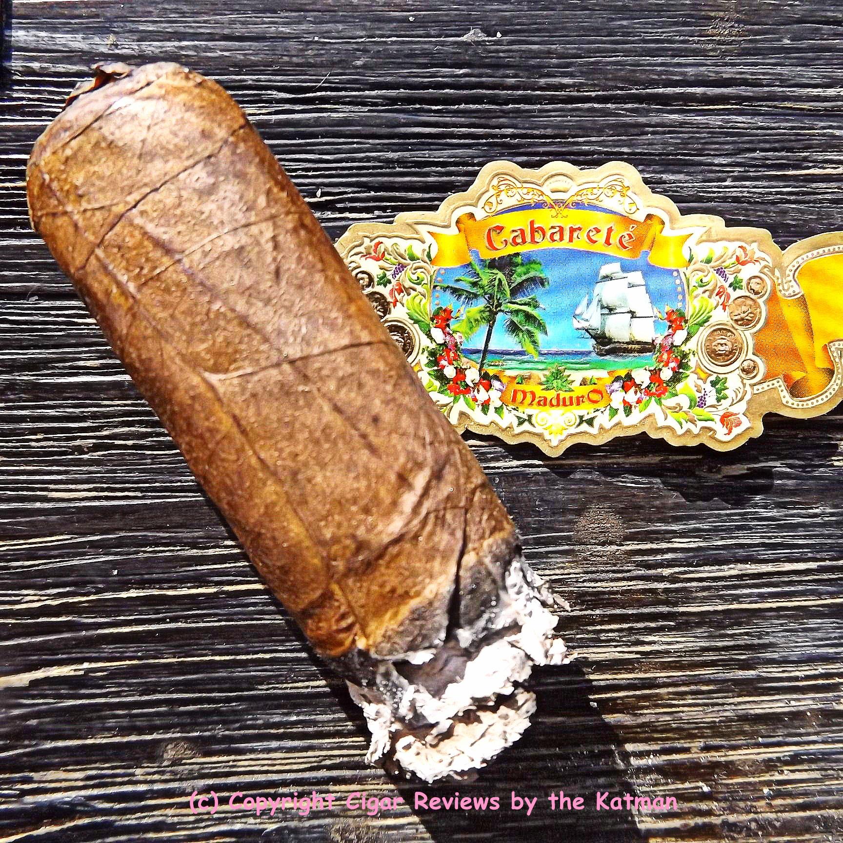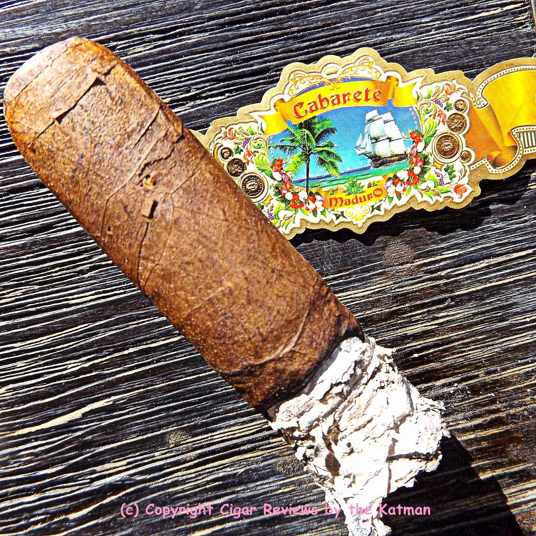 Nice looking crisp box press. The wrapper is dark coffee bean with a tinge of reddish hue. Seams are nearly invisible. Lots of small veins and a gorgeous mottled look. The triple cap is virtually seamless. And the cigar band shows a scene from the beach at Cabareté. This is a small island in the Caribbean.
