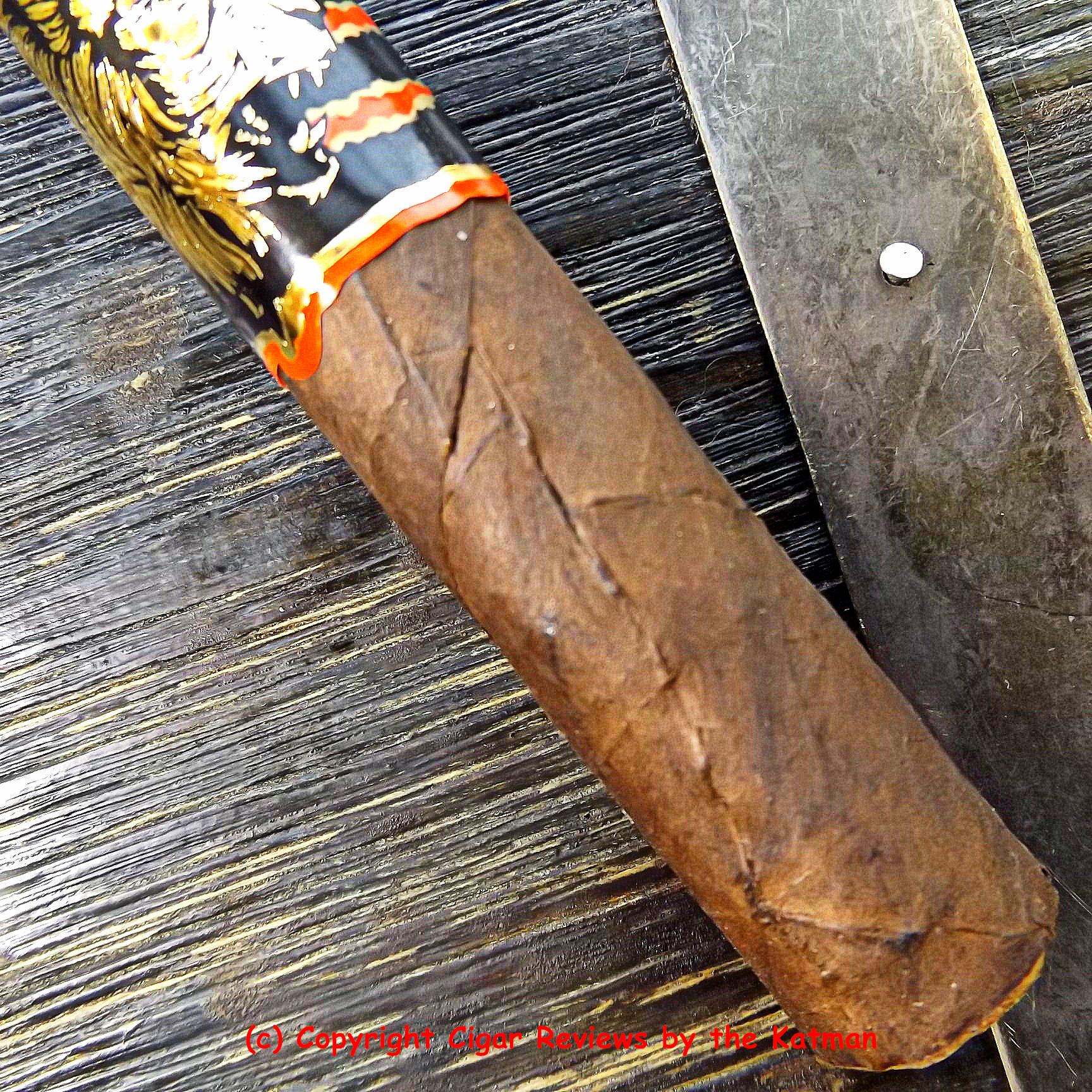 This is not a pretty cigar. It is covered up by exotic main and foot cigar bands. But one can see it is very oily with a bunch of toothiness. Seams are a mess. Lots of wrinkles. Big honkin’ veins. And an incredibly sloppy double cap. The cigar is extremely airy. Could float away any moment.