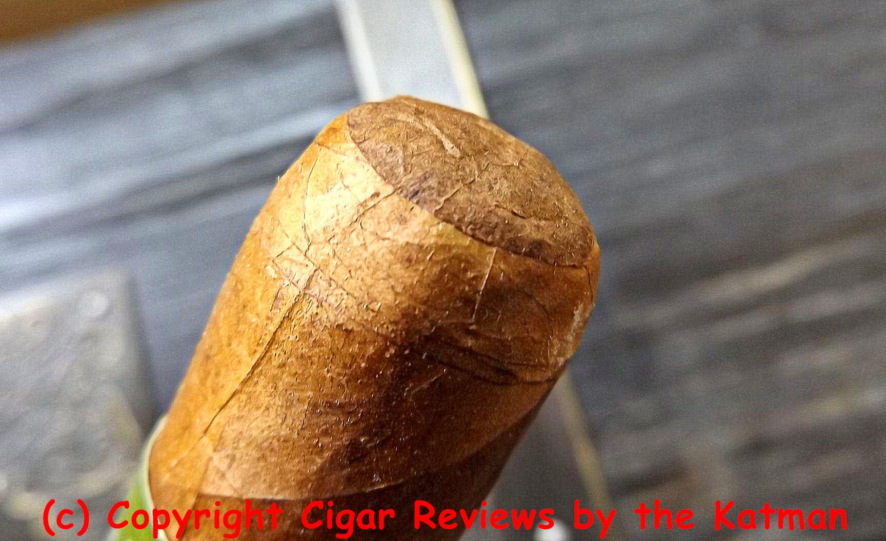 The cigar is a solid baby. But with the right amount of give when pressed gently. Seams are dead tight. There are lots of veins, both big and small. The wrapper has a semi-oily quality. The triple cap is nicely done with the top having a yarmulke made of the darker Nic wrapper.