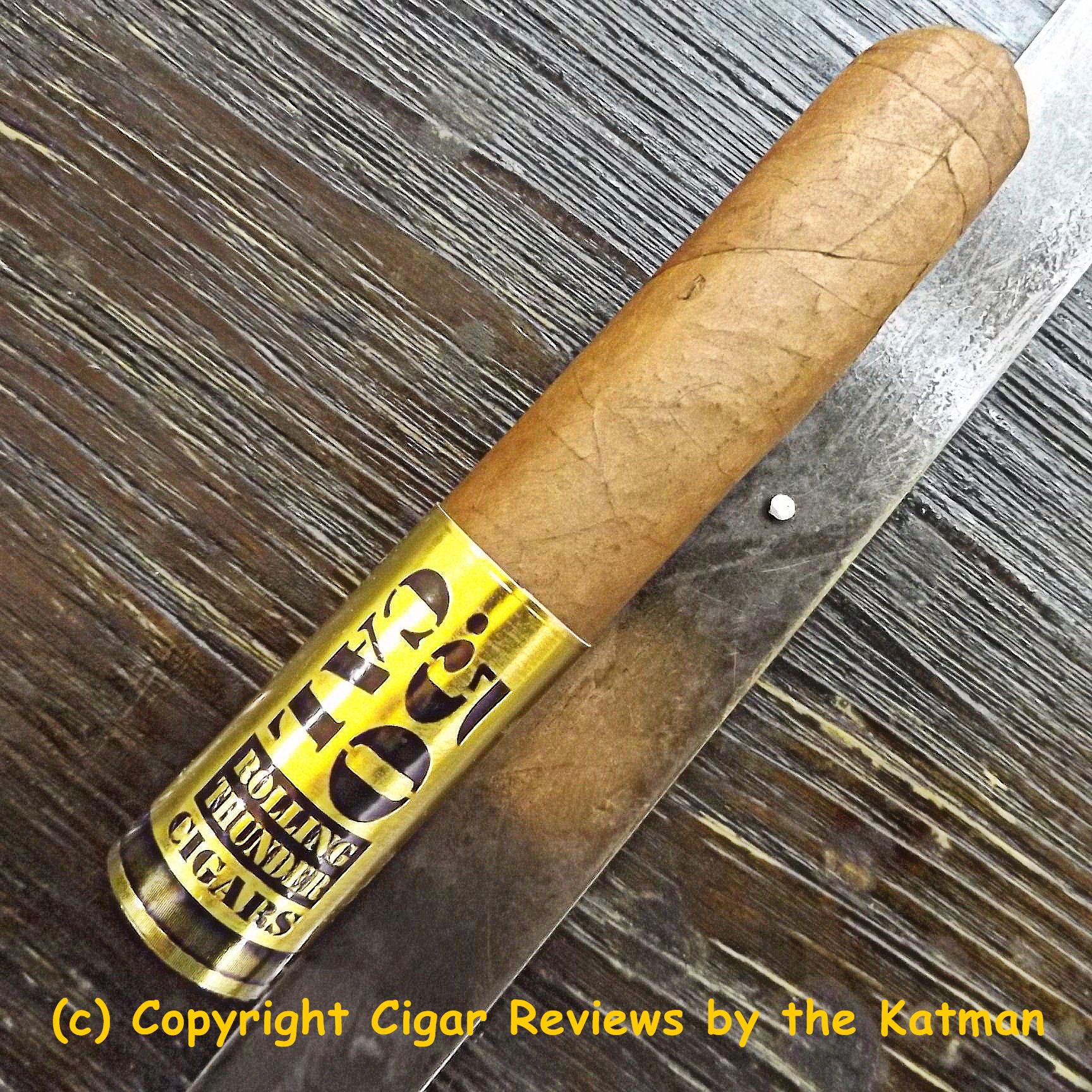 A solid cigar with lots of veins. Hidden seams. A nicely applied triple cap. The wrapper is an oily light brown. Like all Rolling Thunder cigars, the band is at the foot and must be removed prior to lighting up.