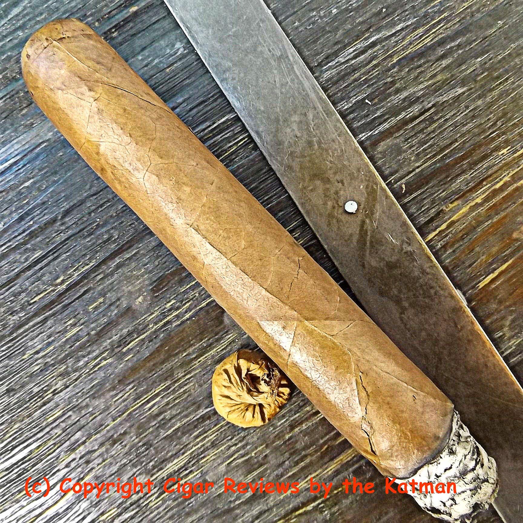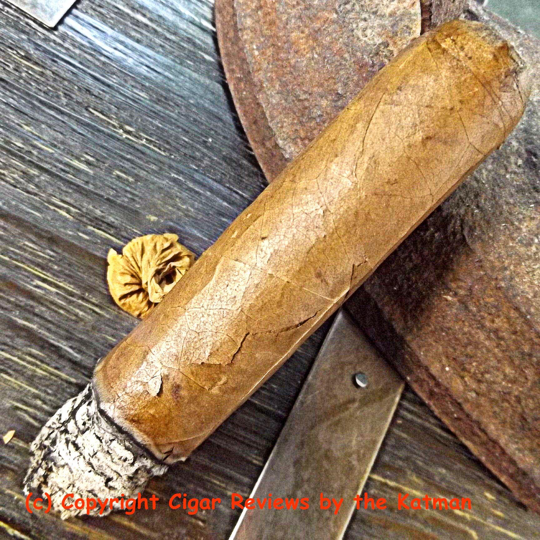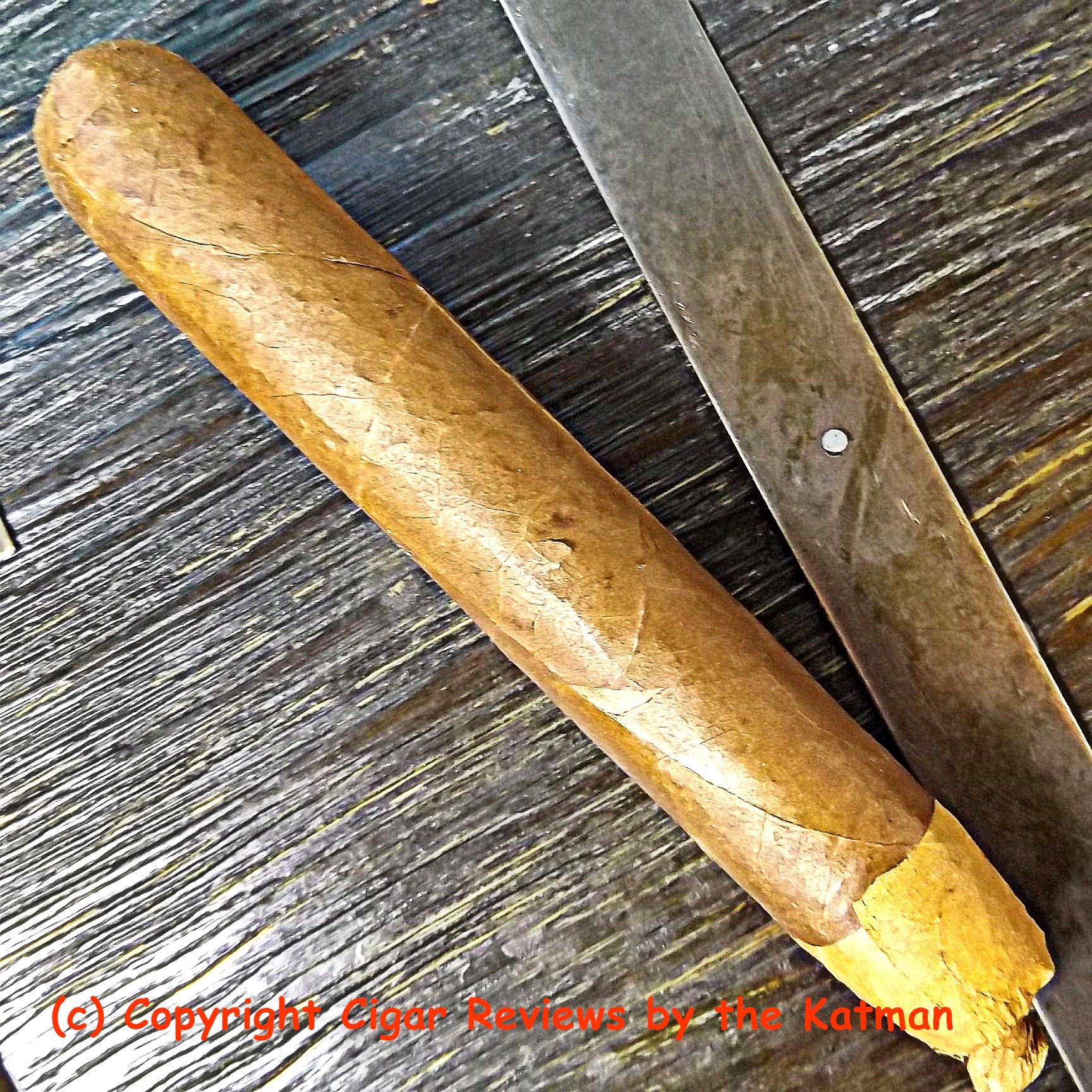 The wrapper is quite nice. A light oily brown color. Invisible seams. Few veins..but a couple long ones to break things up. An impeccable triple cap. Slightly toothy to the touch.