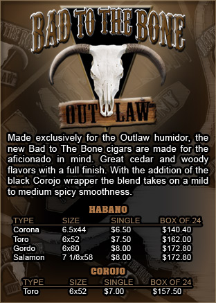 The Bad to the Bone by The Outlaw Cigar Company was very gratifying. A nice easy going medium body. Loads of flavor. A good stick for newbies. The experienced palate will love picking out the flavors.