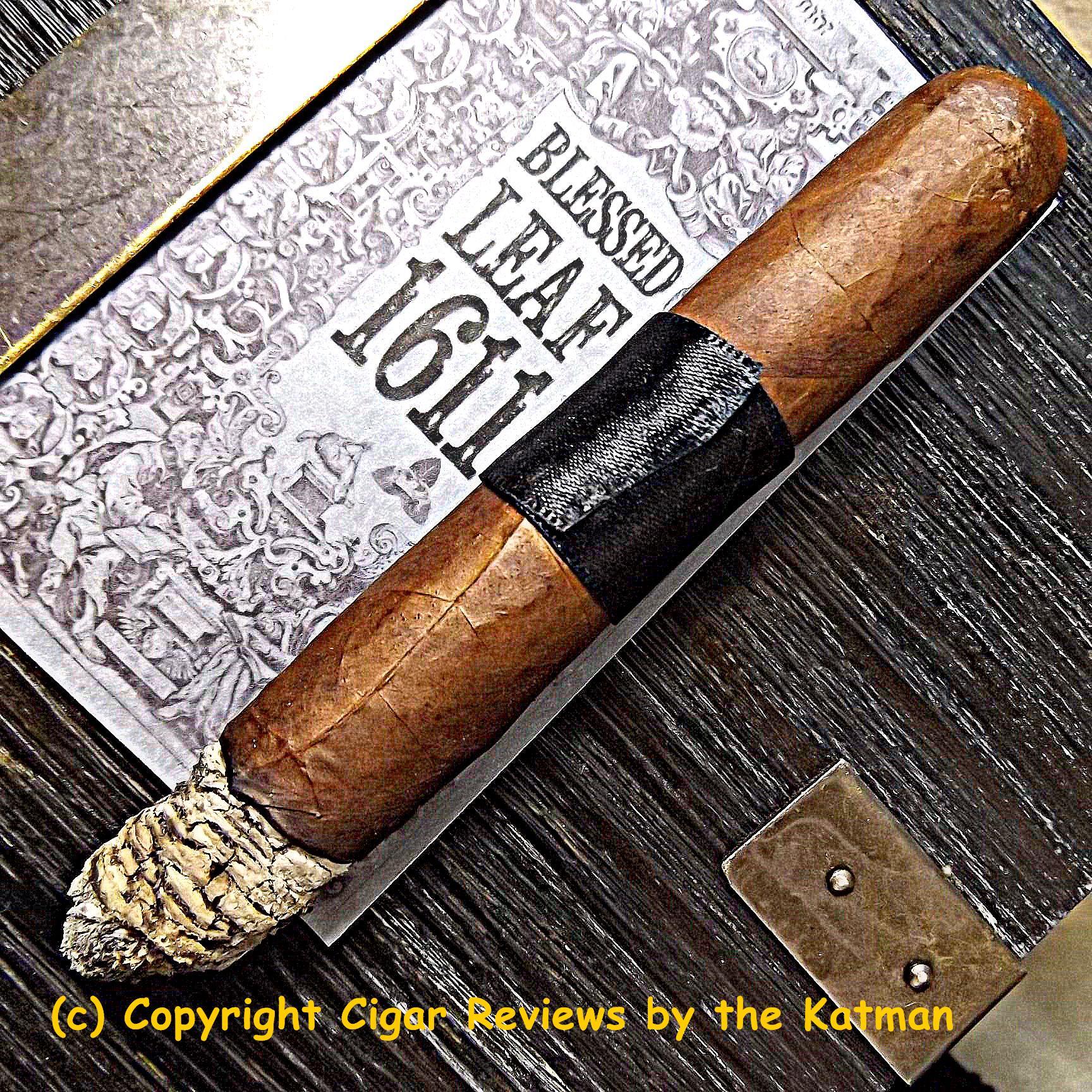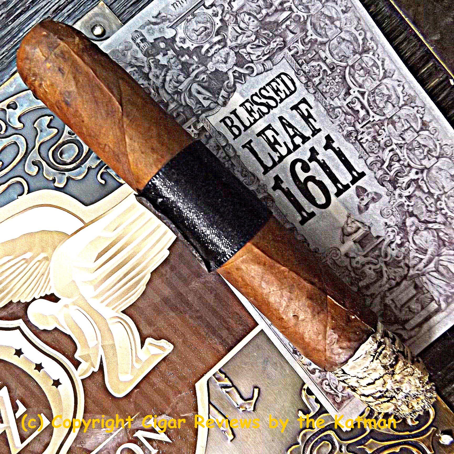 “Draped in a San Andrea (sic) maduro wrapper, the Blessed Leaf 1611 is sweet, creamy, and decadent. Medium in strength, the 1611 delights the palate with candied fig, cashew, cocoa, and oak. Notes of white pepper, coffee bean, and vanilla compliment the core flavors throughout.
