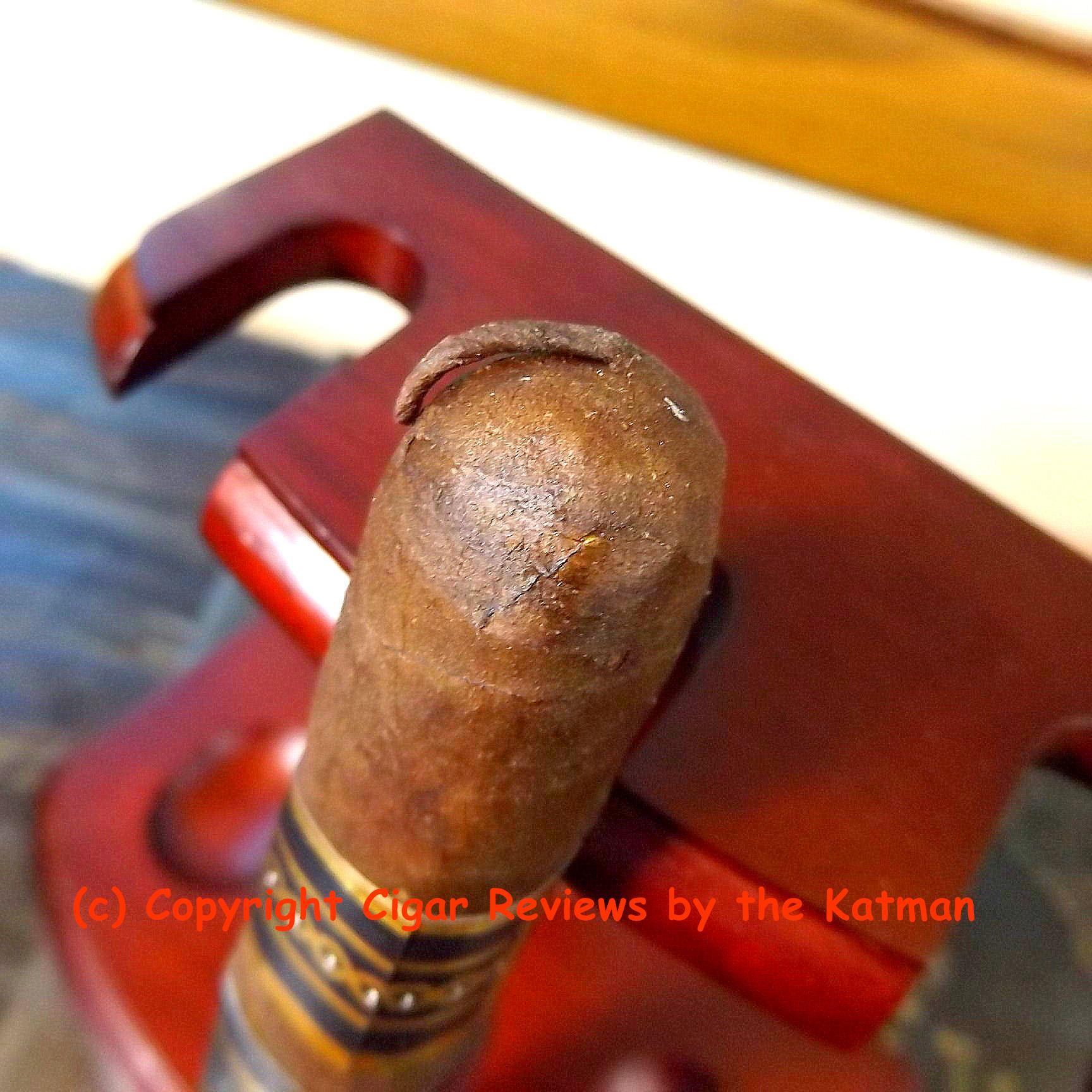 A very rustic looking cigar. Lots of tooth. Seams are tight. Lots of veins running this way and that. The cigar has a soft box press. I have two sticks. One is solid as a rock. The other has some soft spots.