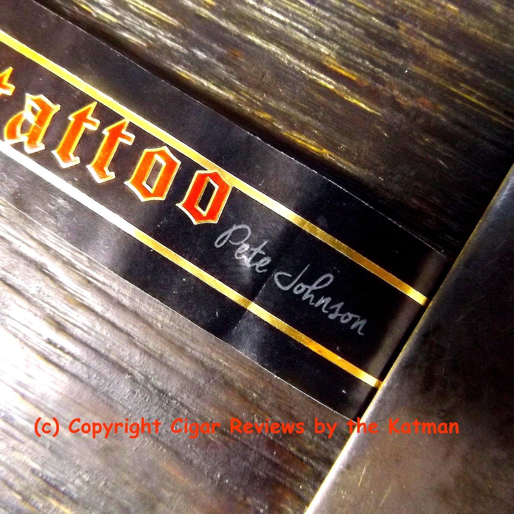 The double cigar band presentation is nice. The Henry Clay band is typical until you turn it to see some filigree. The secondary band says “TATTOO but in the shadows is Pete Johnson’s signature barely visible along with Henry Clay written on the other side of TATTOO. Had to remove the band to see this.