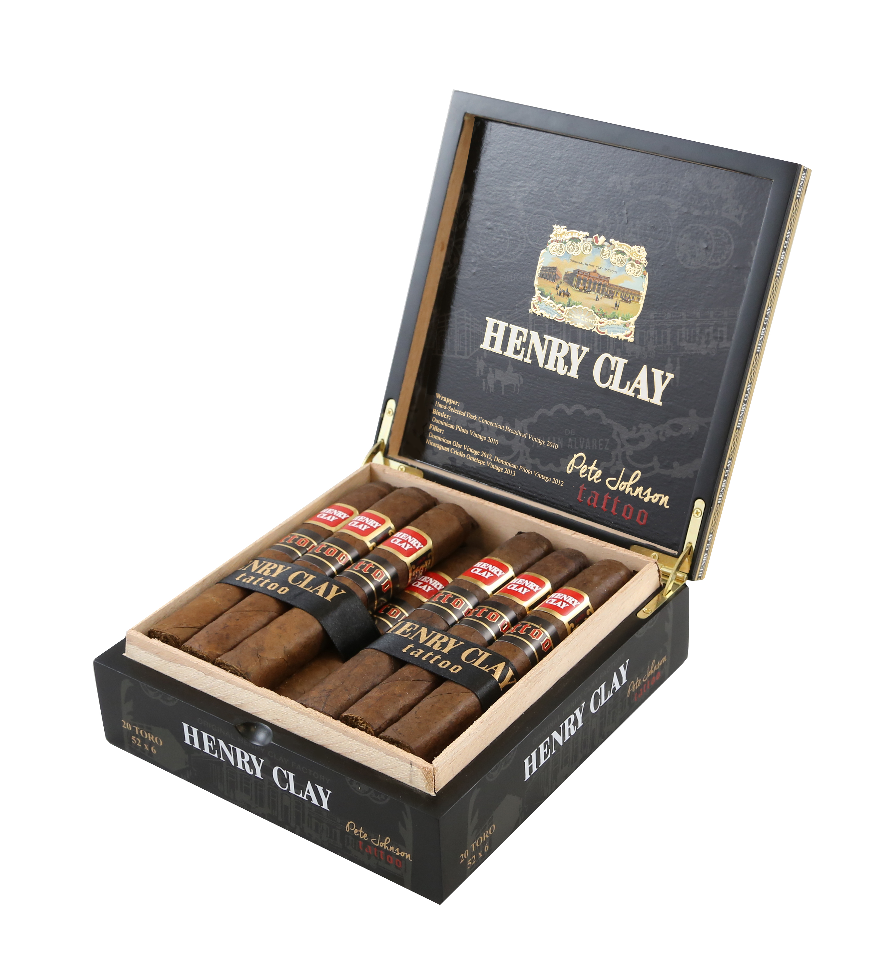 “Henry Clay Tattoo expresses the soul of Henry Clay in a fuller-bodied and robust cigar that pairs an oily, dark brown Connecticut Broadleaf Vintage 2010 wrapper to flavorful Dominican and spicy Nicaraguan fillers. The excellent smoke blends new and old, with handcrafted cigars capped with a rustic pigtail twist and stylish black packaging that is sure to stand out in even the most discerning humidor.”