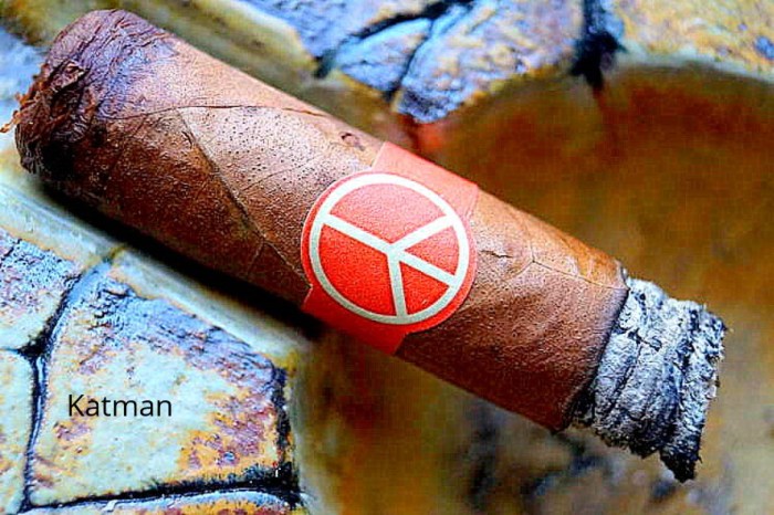 An oily cinnamon/ginger colored wrapper full of tooth makes for a pretty cigar. Seams are hidden. But oh those veins. They look like Richard Nixon’s legs when he had phlebitis. I must assume there is a triple cap condition at hand because the striations designating each cap are indistinguishable. The peace symbol on the cigar band takes me back to my younger years. I missed Woodstock but I did see Strawberry Alarm Clock at Recreation Park in Long Beach, Ca. Literally, tens of people showed up.