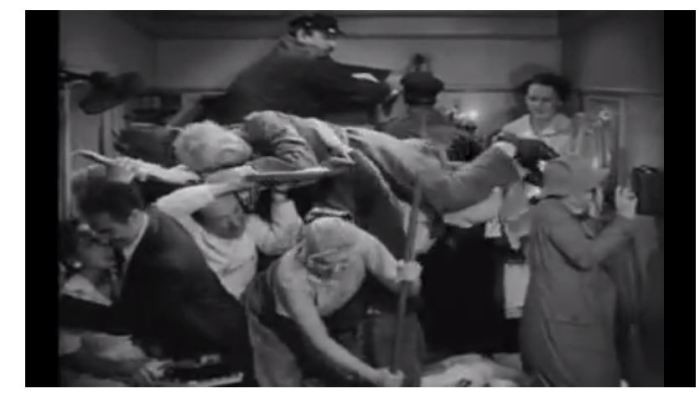 We are all standing in the compartment like the Marx Bros’ “A Night at the Opera.” Couldn’t move. But then I began flapping my arms thinking we were going to German prison.