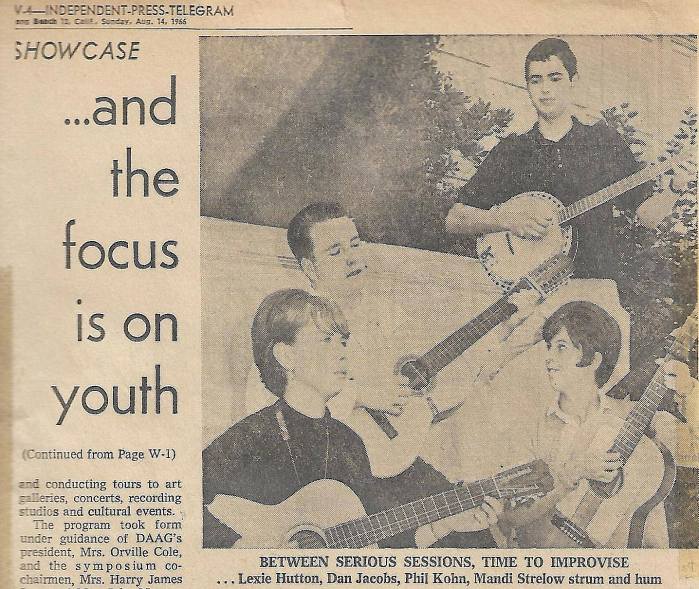 One aside, for those musicians that read me…I, stupidly, put a garter belt over the headstock of the bass covering up the Hofner name. And a stupid ass looking decal. It was 1966 and I was dumb as a rock. I think I had a cutout of the Playboy bunny logo on the bridge of my 5-string banjo. I shudder when I see the photo below. It was also during the summer of 1966. All the high schools in Long Beach provided 3 students in music, art, and drama to go to this day camp sort of thing and at the end, put on a production for parents and friends.