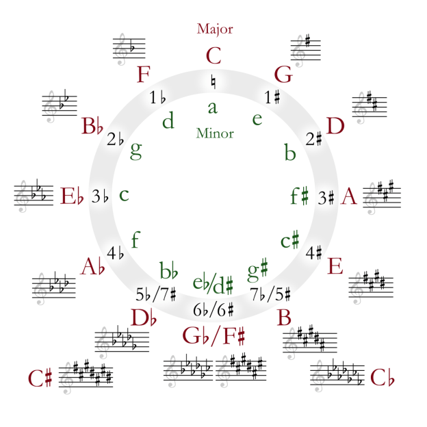 The diagram below shows it simply. Start with the C note at the 12:00 position and move clockwise to see its perfect fifth. Those are the chromatic notes in a major chord. The interior notes are a circle of fifths in the minor key. Both are written in treble clef. For bassists, it will be written in bass clef. Get it? Got it. Good.