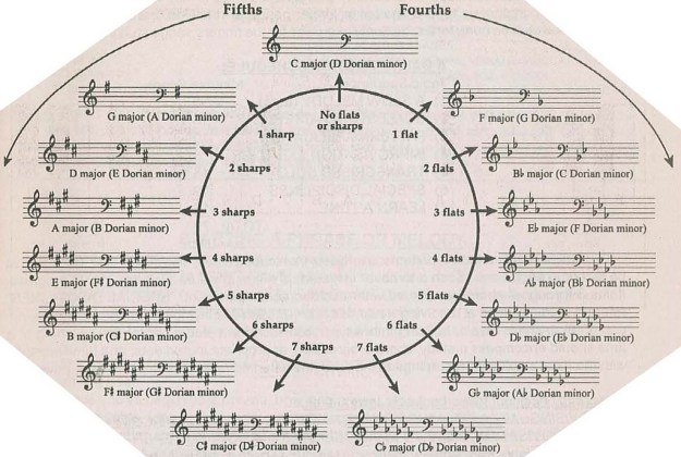The diagram below shows both circle of fifths on the left and circle of fourths (blues) on the right in the Dorian Mode. And shows the musical staffs in both treble and bass clefs. Dorian mode is represented by the natural diatonic scale D–D (containing a minor 3rd and minor 7th). Get it? Got it. Good.