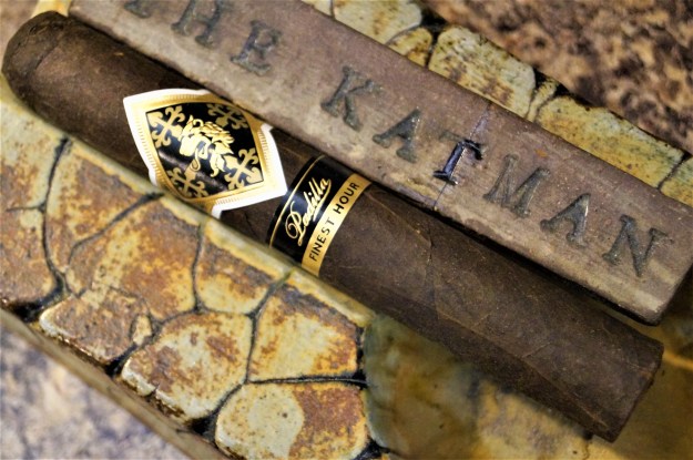 A tree branch gone amok. Barely a touch of oiliness on the wrapper…pretty much flat black. I’d call it coffee brown under the threat of torture. A fine grit, like a cat’s tongue, covers the entire cigar. Certainly, no shortage of veins. Looks like a map of Bakersfield. The cap looks better in person than in my photograph. Its application of the cap is so tight that I believe it is a two-cap bludgeon. The cigar feels like a heavy weight in the hand. Zero give when depressed.