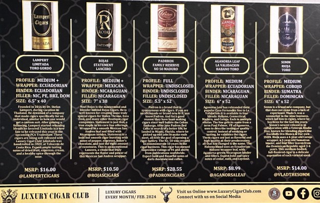 The Palladium subscription is the latest addition to the Luxury Cigar Club memberships and is nearly identical to the Platinum subscription. As a Palladium member you will receive 5 cigars monthly, and occasional freebies and surprises. The popularity of the sold-out Platinum Tier encouraged us to open a parallel service and it is just as good! We understand that the cost of a cigar does not always indicate the quality of the smoke, however, we make sure to provide the highest value per dollar on the market- each box will contain a retail value higher than the price of the monthly subscription. As a member of Luxury Cigar Club, you are part of the family, that means you receive special deals, discounts and are part of a growing social club, on and offline. We reserve the right to substitute any cigar with a different cigar of the same value, or higher, in case of inventory requirements.