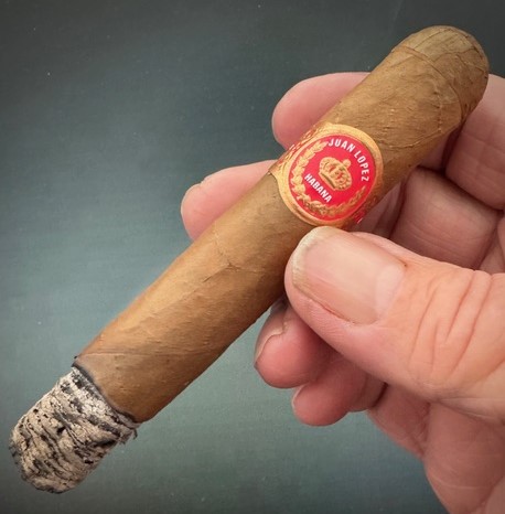 This Juan Lopez Selection Number 2 is reddish brown and has a solid feel. The appearance is “rustic charm”, rough with veins and scratchy as a cat’s tongue. I hit it with my Perfec Punch. The cold draw is perfect. I fire it up.
