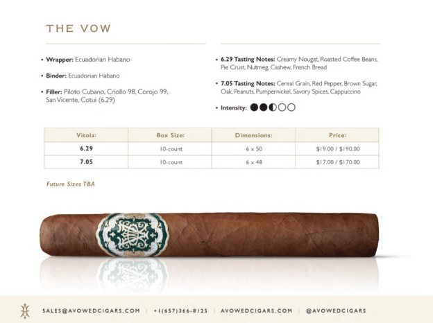 “Crafted with the renowned Toro vitola in mind, 6.29 dials back the intensity to offer a more approachable experience. This size allows us to include Cotuí tobacco to create a cigar that is the essence of indulgence. This expression of the Vow begins and ends with a delicate sweetness.”