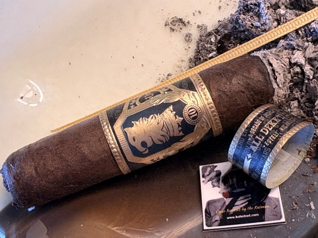The cigar’s presentation is fancy. I can remember from my brick-and-mortar salesman days a smoker asking if they should smoke the footer band. Sometimes I said yes because I needed a laugh but kept a fire extinguisher nearby. I remove the ribbon but don’t hear a pop so it must have been a dud.