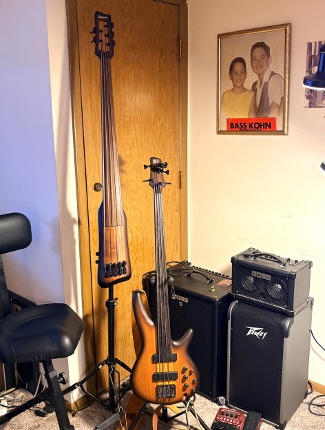 I received my new Ibanez SRF700 fretless yesterday. I am over the moon. It’s better than my beloved 1980 Schecter fretless. I don’t say that lightly. The SRF700 is the best bass I’ve owned. While it is not really fair to compare new technology with 45-year-old technology, I am comfortable with my statement. I have a sudden urge to play out once again. If only I didn’t have arthritis and could memorize 100 songs. My favorite bass design is the Fender Jazz. It has a slim neck and a beautiful warm sound. The neck on the SRF700 is more like the Fender Precision which is like holding a 2 x 4. But the neck is so fast that it is a minor adjustment for hands that are older than Adam. Look at the length of the neck. 30 frets access (fret markers on the side of the neck) instead of the usual 24. Its neck is longer than my upright’s. Amazing. I have never owned a bass that had more than 3 controls. This one has 6. I found myself laughing at the baphillion katman-phonic options. Great bassists have big banana fingers. My fingers are mini cucumbers. Starting today, I will take lessons from several YouTube video instructors that are quite good. You are never too old to learn…or freshen up on things forgotten.